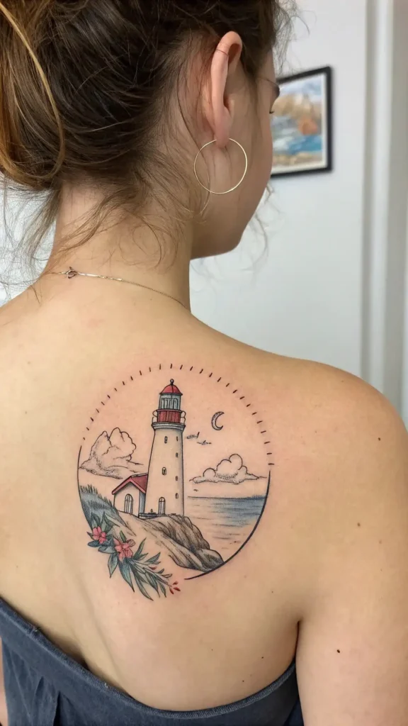 When it comes to placement, a dramatic seaside lighthouse scene works well on larger areas of the body, such as the back or chest.