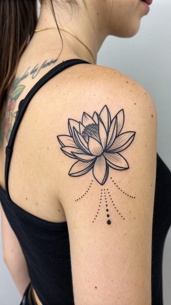 A small, stylized lotus flower can be placed almost anywhere on the body, from the wrist to the shoulder blade. To add an extra layer of meaning to your design, you can incorporate a few strategically placed dots or lines to represent the flower’s roots or petals.